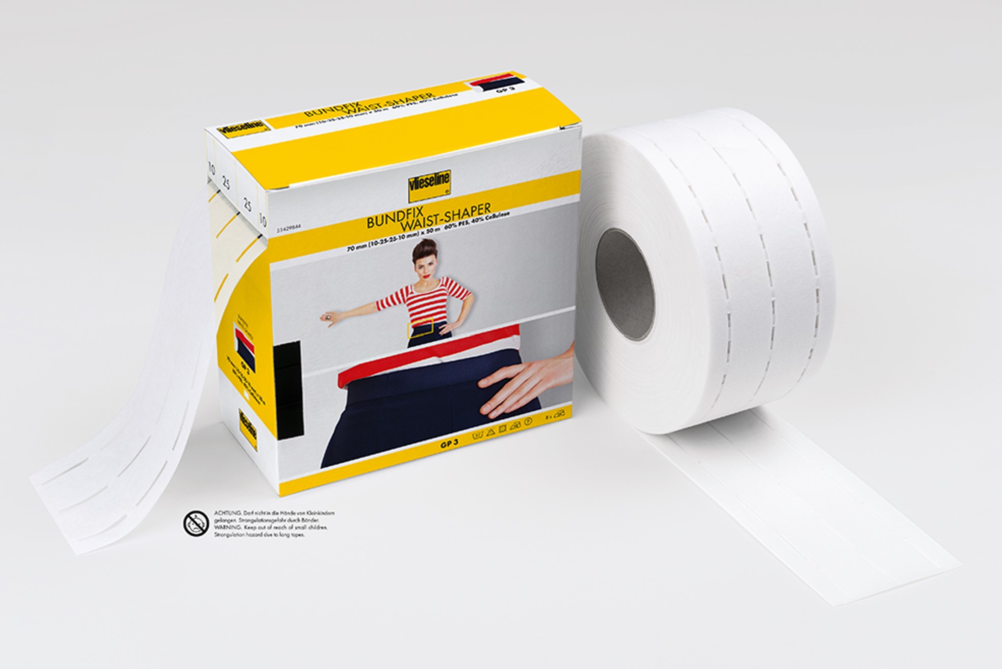 Heavyweight fusible tape made from a blend of synthetic fibres with perforated lines that serve as a guideline while sewing and define a fold.