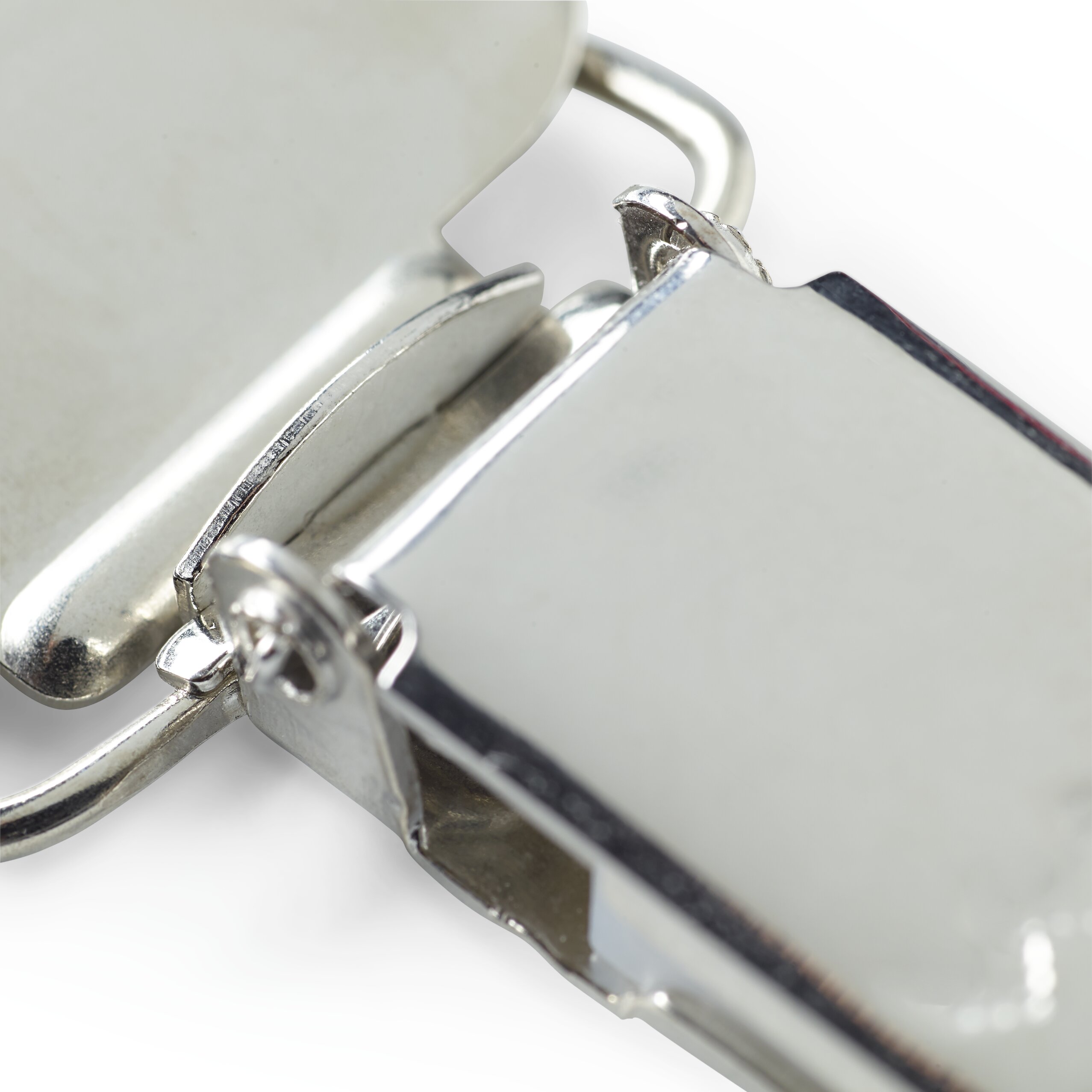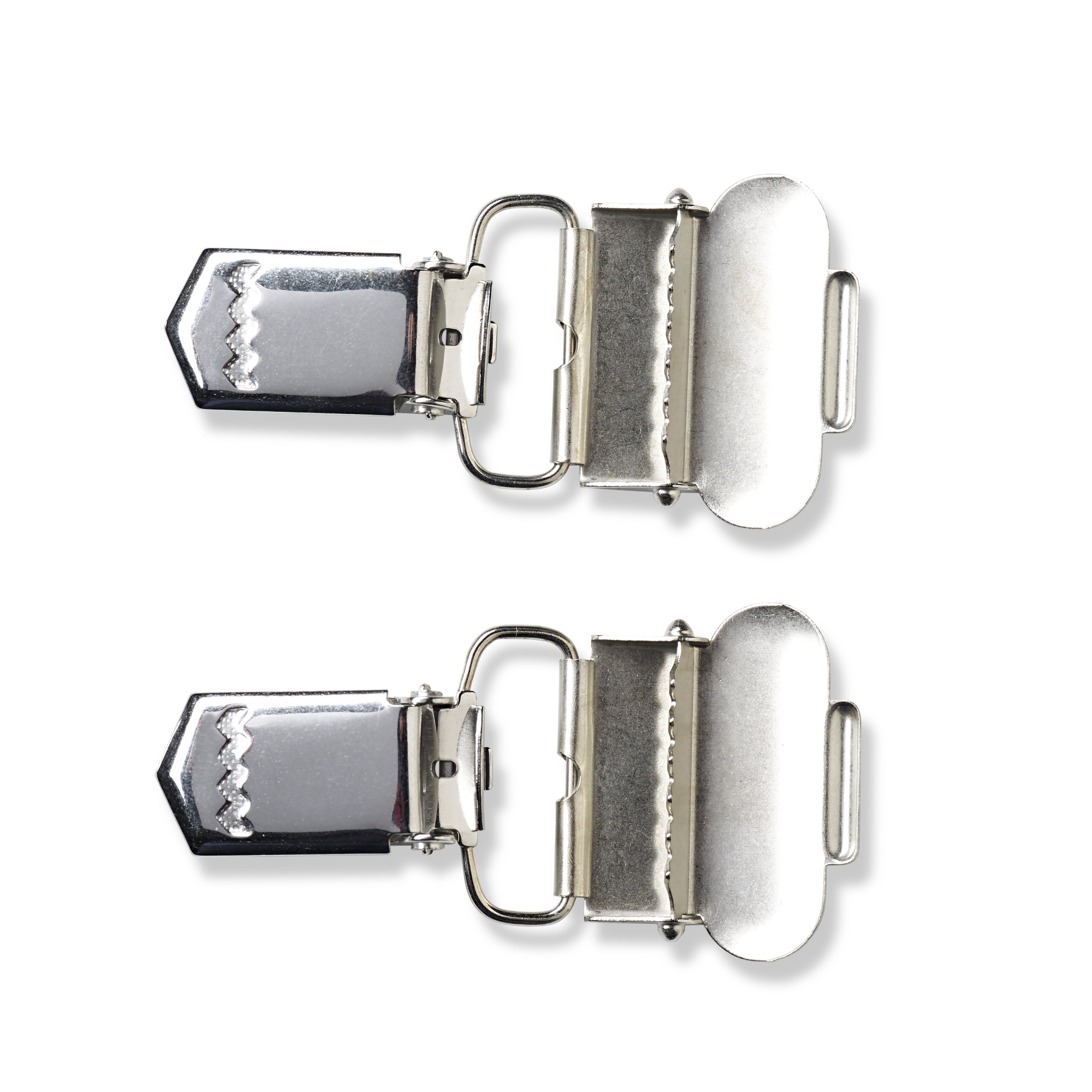 The Combi-clips are versatile, because they can be used as a fastener for dungarees and also as classic clips for braces. A clip on your braces is broken? No problem, because the Combi-clips can be easily used as replacements. Without needles and threads, they are simply clamped to the braces strap by means of the clamping mechanism. In addition, the length of the strap can be varied by means of the hinged buckle. The clip is securely fixed to the strap by means of its toothing. The silver coloured Combi-clips are extremely robust and have a long useful life.